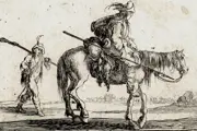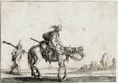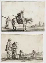 Een soldaat te paard naar rechts en een andere soldaat te voet achter naar links, met soldaten en karren in de verte. c.1642 Ets --- De Vesme/Massar 1971 / Stefano della Bella (108.II)