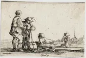 Twee arme mannen die leunend op staven staan te praten met een kreupele die op de grond zit, met rechts achter een vrouw en een kerk op de achtergrond. c.1642 Ets --- De Vesme/Massar 1971 / Stefano della Bella (116)