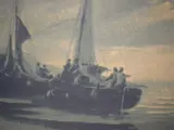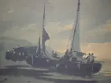 Onderwerp:Viskotters op strand in Nederland.