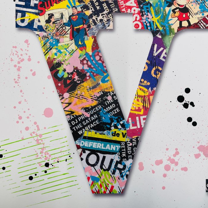 De kunstenaar: Aïroh, geboren in het zuiden van Frankrijk in 1987, is een Franse kunstenaar. Hij tekent en schildert van jongs af aan. Hij werkt al enkele jaren als grafisch ontwerper in Frankrijk en Zwitserland en laat zich inspireren door Pop Art en New Pop Art trends. In sommige van zijn werken verwerkt Aïroh markeringen om mensen te herinneren aan hun verslaving aan consumentenproducten. De grafische kracht van deze grote merken heeft zowel een effect op ons collectieve onbewuste als op onze esthetische codes. In navolging van zijn voorgangers gebruikt Aiiroh gemengde en actuele media, zoals de collage van Swarowsky-kristallen, acrylverf of spuitverf en stencils.