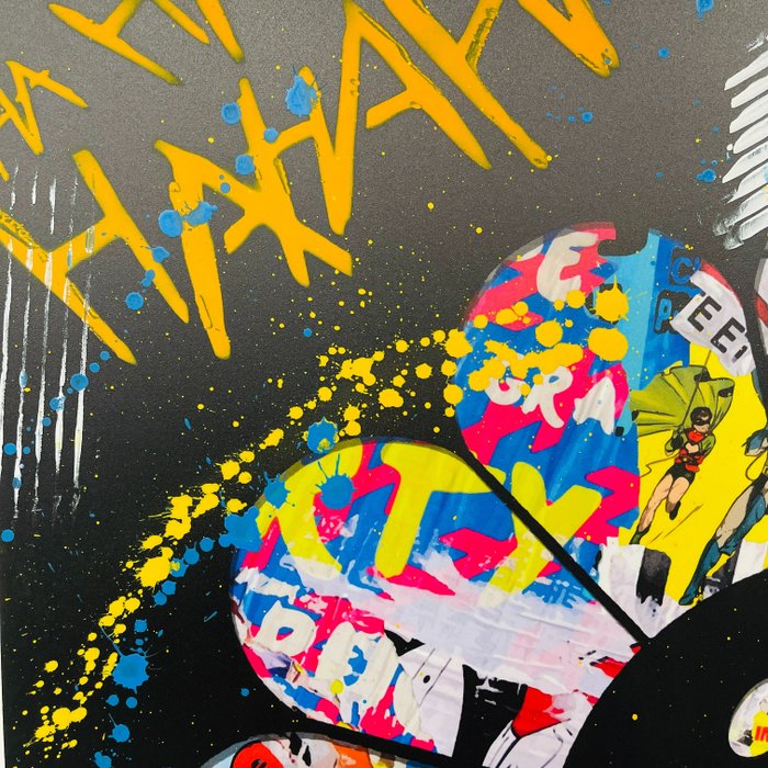 De kunstenaar: Aiiroh, geboren in het zuiden van Frankrijk in 1987, is een Franse kunstenaar. Hij tekent en schildert van jongs af aan. Hij werkt al enkele jaren als grafisch ontwerper in Frankrijk en Zwitserland en laat zich inspireren door Pop Art en New Pop Art trends. In sommige van zijn werken verwerkt Aiiroh markeringen om mensen te herinneren aan hun verslaving aan consumentenproducten. De grafische kracht van deze grote merken heeft zowel een effect op ons collectieve onbewuste als op onze esthetische codes. In navolging van zijn voorgangers gebruikt Aiiroh gemengde en actuele media, zoals de collage van Swarowsky-kristallen, acrylverf of spuitverf en stencils.