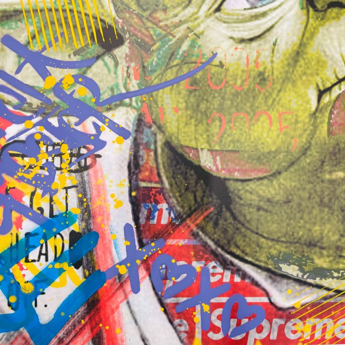De kunstenaar: Aïroh, geboren in het zuiden van Frankrijk in 1987, is een Franse kunstenaar. Hij tekent en schildert van jongs af aan. Hij werkt al enkele jaren als grafisch ontwerper in Frankrijk en Zwitserland en laat zich inspireren door Pop Art en New Pop Art trends. In sommige van zijn werken verwerkt Aïroh markeringen om mensen te herinneren aan hun verslaving aan consumentenproducten. De grafische kracht van deze grote merken heeft zowel een effect op ons collectieve onbewuste als op onze esthetische codes. In navolging van zijn voorgangers gebruikt Aiiroh gemengde en actuele media, zoals de collage van Swarowsky-kristallen, acrylverf of spuitverf en stencils.
