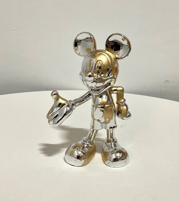 Artistieke interventie op Mickey Mouse-beeldhouwwerk.