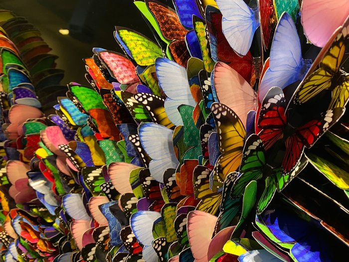 Het betreft een combinatie van ongeveer 200 kleinere kleurvolle vlinders geprint op speciaal fotopapier met designer prints zoals Gucci en Louis Vuitton monogram logos.