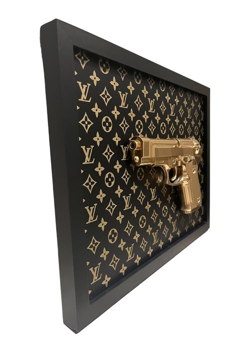 Golden gun, in combinatie met een gouden matchende Louis Vuitton monogram achtergrond. De buitenlijst is mat zwart hout.