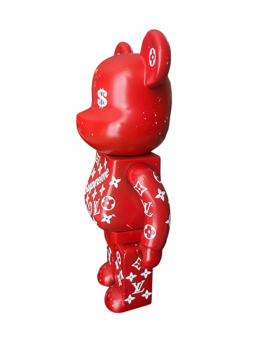 Louis Vuitton bearbrick in de uitvoering supreme cash. Prachtig en stoer modern decoratie beeld met een hoogte van 28 cm en 12,5 cm breed. De hoofdkleur is donker rood in combinatie met mat witte monogram logo’s, supreme en dollar logo’s. Bijpassend zitten er witte verf spetters op rondom de bearbrick.