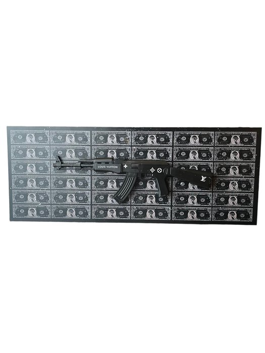De maat dit schilderij is 100 cm breed bij 40,5 cm hoog. Het hoofdmateriaal is forex in combinatie met een overgespoten ak47 in de kleur mat zwart, met witte Louis Vuitton monogram logo’s en bijpassende witte verf spetters over de achtergrond.