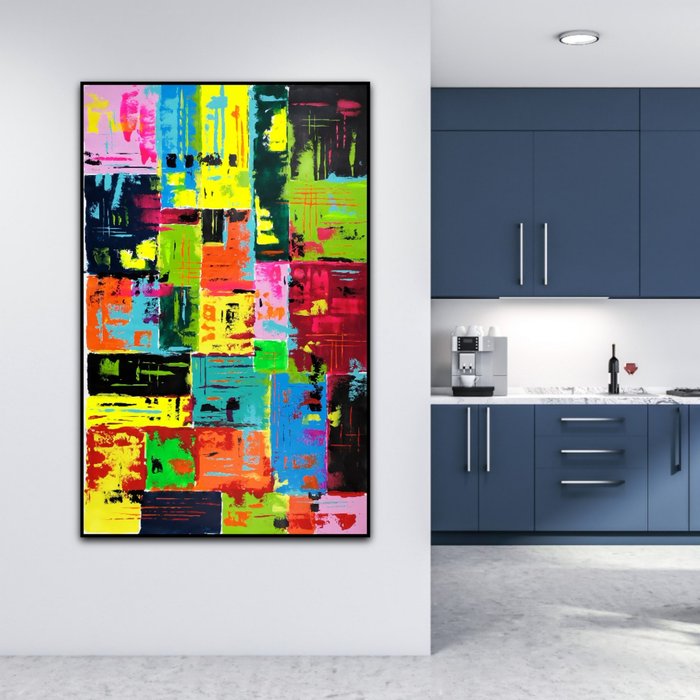 Grote, gedurfde en levendige kleuren geometrisch en expressief abstract. Perfect voor moderne interieurs, kantoren en wachtkamers.
