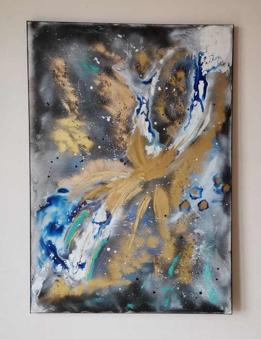 Abstract schilderij geïnspireerd door de ruimte. Klaar om op te hangen. (Buiten continentaal Europa wordt het schilderij in een kartonnen koker verzonden). Perfect voor moderne interieurs, kantoren en wachtkamers.