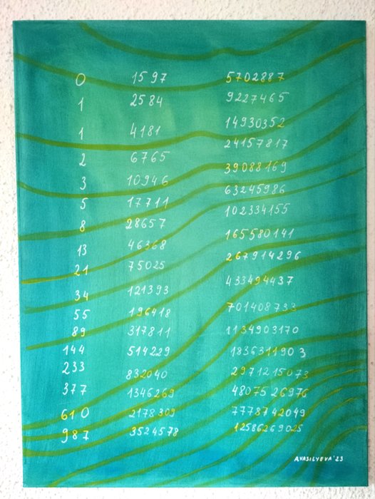 Abstract schilderij gebaseerd op de getallenreeks van Fibonacci, waarbij elk getal de som is van de twee voorgaande.
