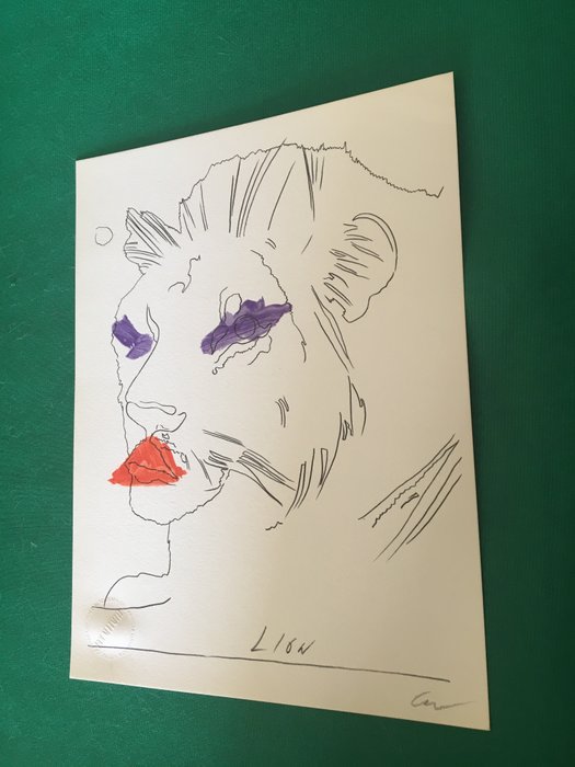 De geveilde fotolithografie, "Lion", uit de serie "The Signs of the Zodiac", is met potlood gesigneerd, genummerd (op de achterkant) en heeft het reliëfstempel van de uitgever als garantie voor de originaliteit. Het is gemaakt voor de collectie "Le Copertine Firmate di BOLAFFIARTE" van Andy Warhol, de kunstenaar die nog populairder werd dan zijn eigen kunst. Zijn handtekening is een merk voor succesvolle producten in de kunst, uitgeverij, film en, achter de objectiviteit van zijn werken, is er het Amerika van het einde van de eeuw.