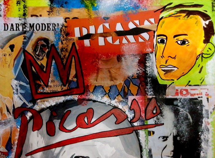 De portretten van Picasso, de eerste in zwart-wit en de tweede, kleiner van kleur, zijn met de hand gemaakt met acrylverf.