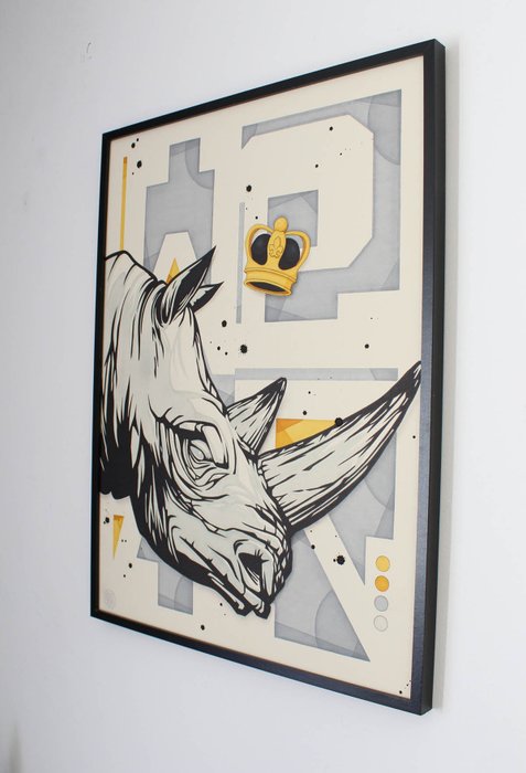 Het werk wordt verkocht ingelijst / houten lijst in zwarte kleur. De afmeting van het ingelijste werk is 62x82cm en 3 cm dik.