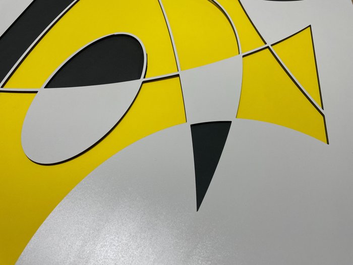 Stukbeschrijving: Mixed media en collage. Houten voorkant. Werk van Antón Uxío. De serie onderzoekt vanuit diepte en structuralisme de geschiktheid van vormen voor een driedimensionale structuur.