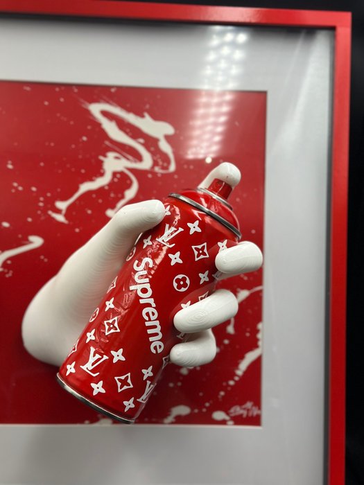Frame met Supreme spray paint en Coca-Cola blik Louis Vuitton subtiele mix tussen luxe, power en Street art...