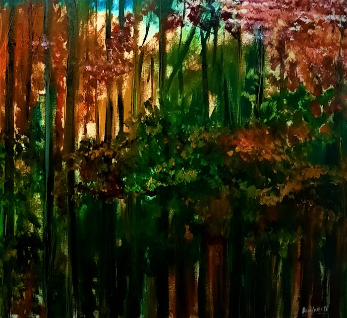 Enkele onbezonnen slagen groot olieverfschilderij op canvas. Het is een landschap van Cannock Chase Forest in West Midland, VK. In de herfst worden de bladeren omarmd door de levendige kleuren en harmonieën. Het is een fantasierijk werk,