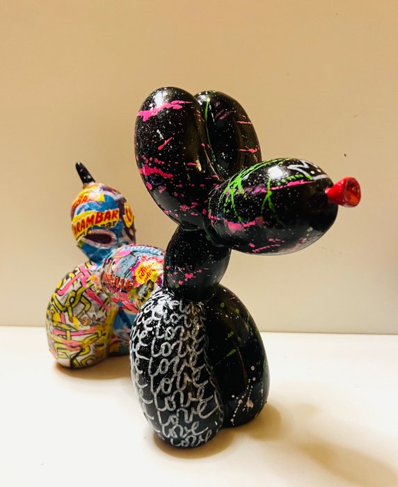 Hars sculptuur van een zeer kleurrijke pop-art ballonhond