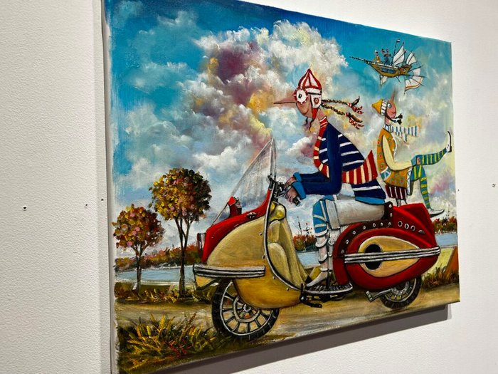 Honderden schilderijen en sculpturen bevinden zich in collecties over de hele wereld, waaronder de VS, Nieuw-Zeeland en zelfs Afghanistan, ook in alle Europese landen. Momenteel geïnspireerd door keramische kunst die op een grappige manier probeert te vertellen over menselijke passies. Achter de sprookjesachtige decoraties gaan de diepste menselijke passies en verlangens schuil. Doek gespannen op houten frame. Kleuren van het schilderij kunnen enigszins afwijken van foto's als gevolg van scherminstellingen.