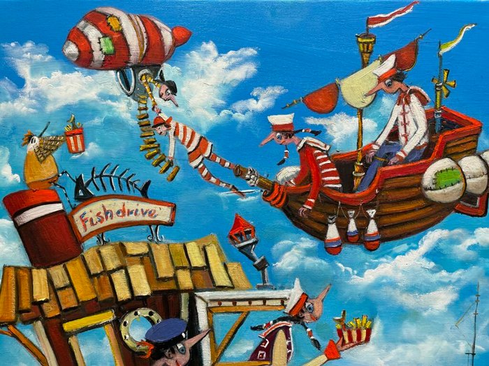 Honderden schilderijen en sculpturen bevinden zich in collecties over de hele wereld, waaronder de VS, Nieuw-Zeeland en zelfs Afghanistan, ook in alle Europese landen. Momenteel geïnspireerd door keramische kunst die op een grappige manier probeert te vertellen over menselijke passies. Achter de sprookjesachtige decoraties gaan de diepste menselijke passies en verlangens schuil. Doek gespannen op houten frame. Kleuren van het schilderij kunnen enigszins afwijken van foto's als gevolg van scherminstellingen.