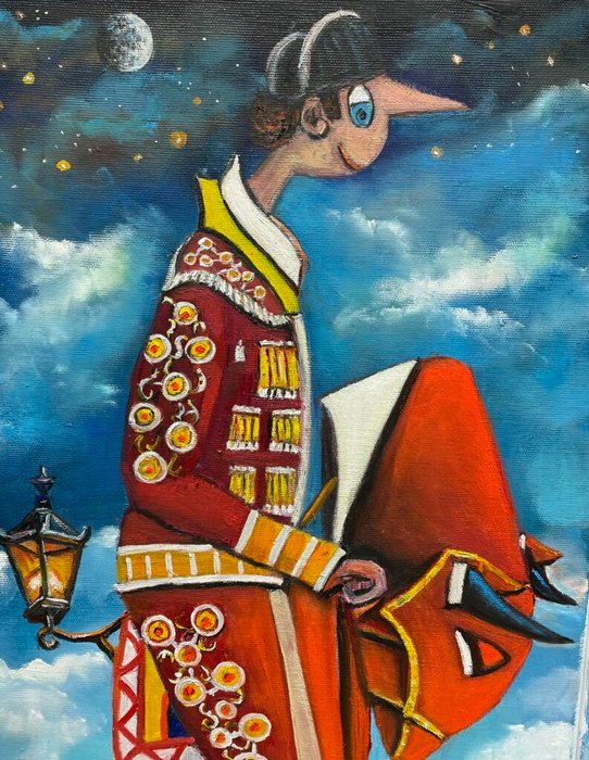 Honderden schilderijen en sculpturen bevinden zich in collecties over de hele wereld, waaronder de VS, Nieuw-Zeeland en zelfs Afghanistan, ook in alle Europese landen. Momenteel geïnspireerd door keramische kunst die op een grappige manier probeert te vertellen over menselijke passies. Achter de sprookjesachtige decoraties gaan de diepste menselijke passies en verlangens schuil. Doek gespannen op houten frame. Kleuren van het schilderij kunnen enigszins afwijken van foto's als gevolg van scherminstellingen.