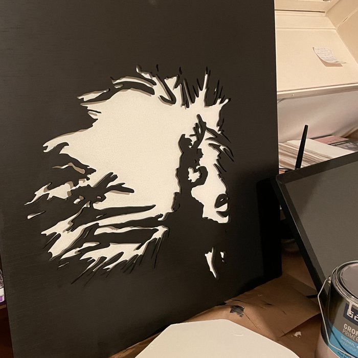 Dit geheel handgemaakte (inclusief lijst) kunstwerk is rechtstreeks afkomstig uit het atelier van de maker. 3 lagen gezaagd en geschilderd houten panelen vormen tezamen een 3D beeld van Tina Turner.