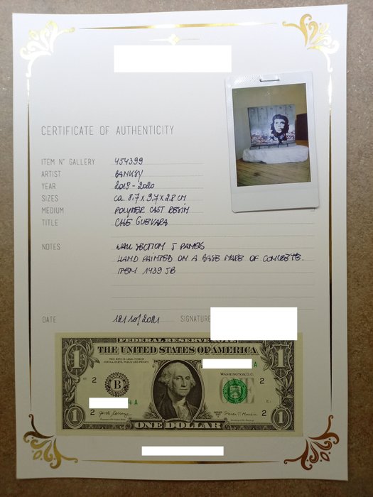 Het nummer van deze originele uitgave is met de hand op de onderzijde van het object aangebracht. De multiple wordt geleverd met 2 echtheidscertificaten: het originele aankoopcertificaat van het Walled Off Hotel (www.walledoffhotel.com) en een echtheidscertificaat ondertekend door Marc Pairon, kunstexpert en auteur van het kunstboek BANKSY - THE WALLED OFF ART EDITIONS zijn UITVERKOCHT!, Stichting Charles Catteau, 2020.