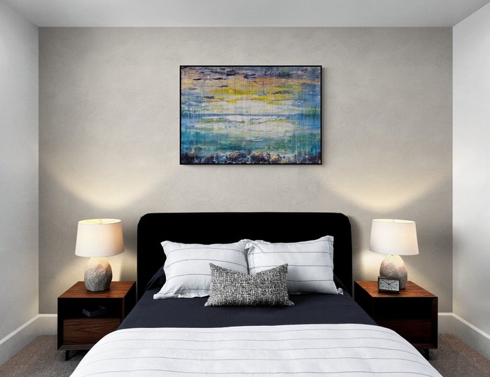 Het schilderij getiteld "Rainy Seascape (XXL)" is geschilderd met hoogwaardige acryl- en olieverf op linnen en katoenen canvas. Mogelijke lichte kleurverschillen kunnen het gevolg zijn van de lichtomstandigheden van de ruimte waarin het schilderij zich bevindt.