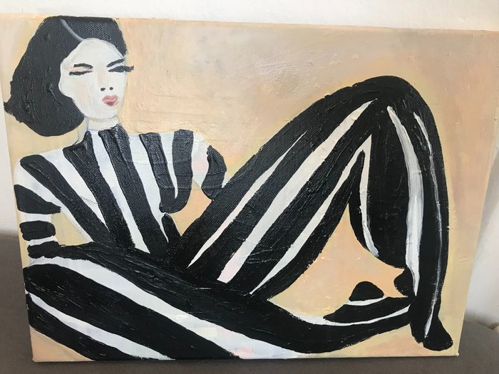 Dit is een klein portret van een vrouw in een modieus pak, zittend in een suggestieve pose. Ze ontspant en neemt haar gedachten af terwijl ze in de verte kijkt. Het is een klein maar zeer gewaagd schilderij dat wat sprankeling aan de muren geeft.