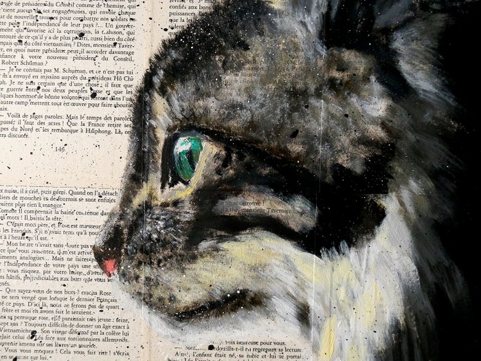 Portret-close-up van een kat. Techniek: olie, acryl en inkt op oud papier gemonteerd op houten lijst. Het houten paneel is gemonteerd op een frame. Klaar om op te hangen!