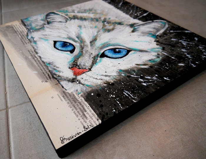 Portret-close-up van een kat. Techniek: olie, acryl en inkt op oud papier gemonteerd op houten lijst. Het houten paneel is gemonteerd op een frame. Klaar om op te hangen!