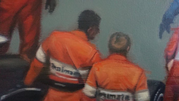 Fraai realistische voorstelling vlak een crash in de Indianapolis 500. Doel was een mooie compositie van figuren die tevens een fraai tijdsbeeld neerzetten. Zo wordt de L compositie mooi in balans gehouden door de rechrhand van de man rechts die mooi overgaat in de witte lijn op de weg. Dit werk is niet ingelijst en wordt aangetekend verstuurd incl een Certificaat van Echtheid rechtstreeks van de kunstenaar. De getoonde lijst is een indicatie als het is ingelijst. Meer informatie en een statement over de kunstenaar vindt u op zijn website.