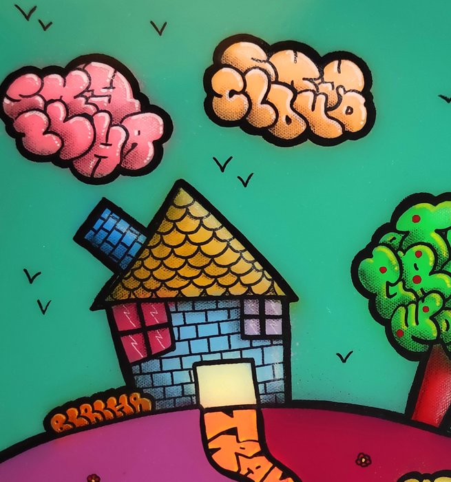 Techniek: Gemengde techniek, spuitverf, acrylstiften op canvas. Hars afwerking. (Een paar microbelletjes)