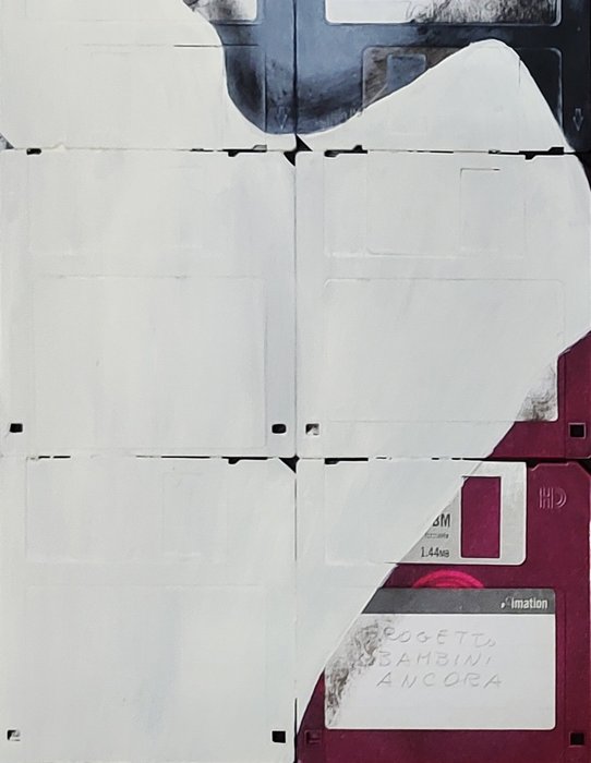 Acrylverf en stift op oude diskettes, met de hand geschilderd, gemonteerd op hardboard. Niet ingelijst
