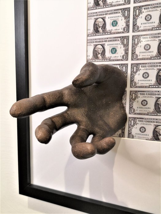 Het werk is gemaakt in 20 exemplaren, een mooie achtergrond van dollars in een passe partout waarop de handen en gezicht in 3D stukken uit het werk komen.