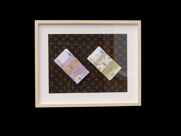 Het werk toont een luxe Louis Vuitton bekend bruin faux leather achtergrond met oker - goudkleurige logo's met daarop 2 bundels van geld (voor alle duidelijkheid is dit GEEN echt geld maar wel zeer kwalitatieve copy's) : een pak van 200€ en 500€ samengebundeld in een Louis Vuitton ecru en witte faux leather.