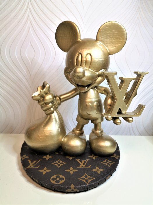 Een goudkleurige Mickey Mouse die een zak geld draagt en het Louis Vuitton logo in de hand heeft.