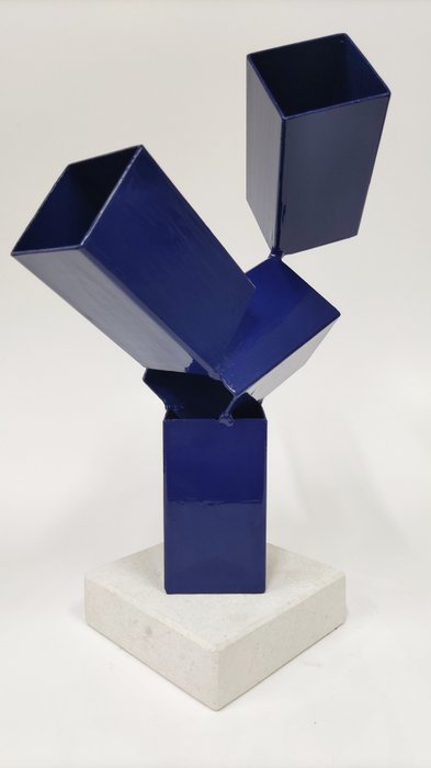 De serie “espacios cúbicos” is ontwikkeld in gelast en gelakt staal, gemonteerd op een stenen sokkel.