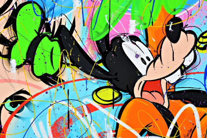 Origineel werk: acrylverf, spuitverf, kleurpotloden en stiften op canvas.
