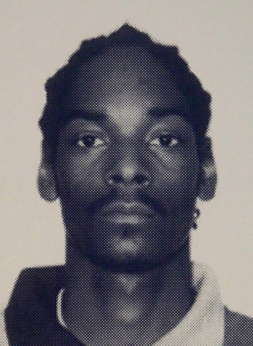 Zeefdruk in beperkte oplage van de Britse kunstenaar David Studwell. Deze zeefdruk van rapper Snoop Dogg is bedrukt met donkerblauwe inkt op een zilveren metallic achtergrond en ziet er in het echt prachtig uit.