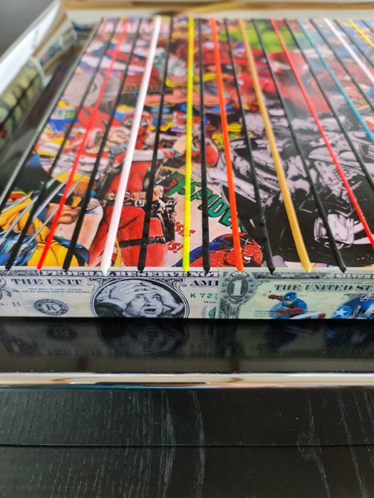 Gemengde techniek collages, acryl op 3D canvas (dikte 4,5 cm), met de hand gesigneerd en medeondertekend. Werk klaar om op te hangen!!