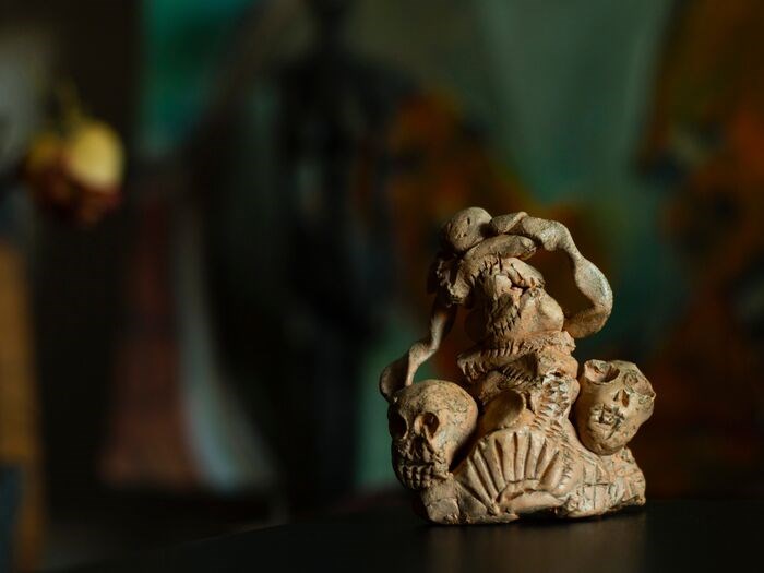 Kleine man met schedels - 8x7x3.5cm - Terracotta en Patina - 2018 (1)