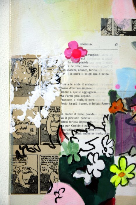 Olie en acryl op canvas, maar ook collages van gedichten, partituren, strips.