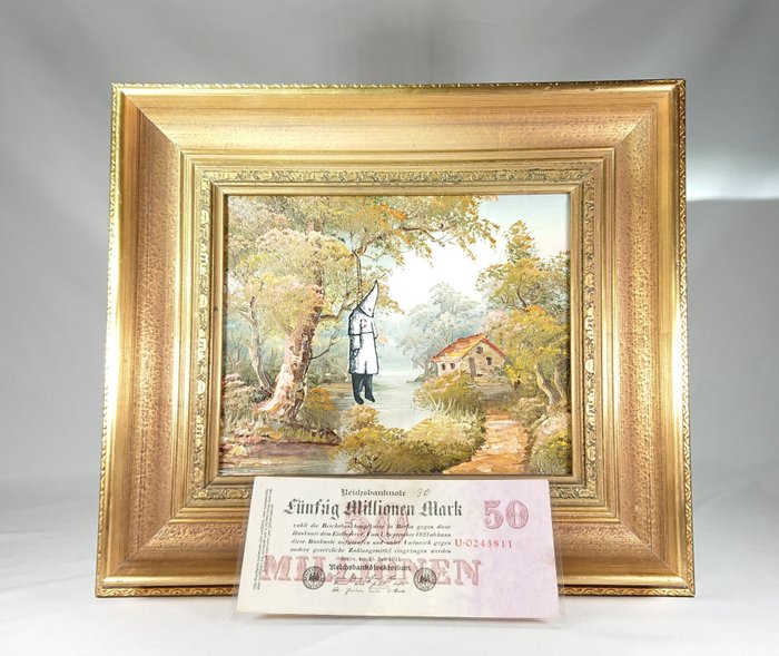 Banksy's Glowing Klansman (Banksy Vs Bristol Museum) is bewerkt, bedekt met hoogwaardige vernis en geheime technieken herwerkt, ondertekend met zijn originele graffitinaam.