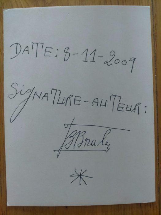 2009. Inscriptie met zwarte balpen op de achterkant "datum: "8-11-2009" gevolgd door "Signature-author: Fbruly" gevolgd door een ster.