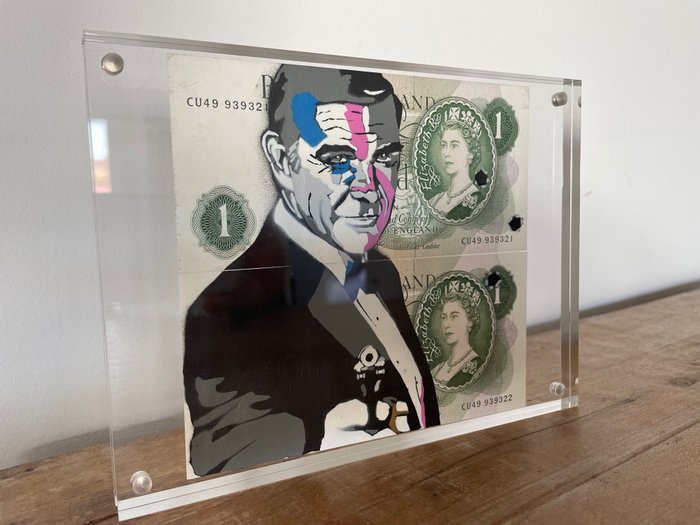 Portret van Sean Connery als James Bond. Het schilderij is gespoten op een reeks authentieke opeenvolgende Engelse biljetten van 1 pond (jaren 60).