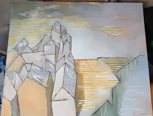 Dit schilderwerk is geschilderd op doek , dat is voor behandeld met Gesso waarna een eerste laag gebroken wit gemengdolieverf , en daarna mijn schilderwerk voorstel ( zie schetsen ) daar op aangebracht Het is ontstaan door 2 aspecten, ten eerste ben ik op bezoek geweest in Frankrijk in het plaatsje Chinon, als je daar naar boven wandelt, krijg je een prachtig uitzicht over de daken van het plaatsje.( zie foto ), ten tweede ,op de academie kreeg ik de opdracht om een schilderwerk te maken Thema "minimalisme", en dit leek mij een goed voorbeeld om de daken te bestuderen , of hier iets mee te doen was. Bij het foto en schetsmateriaal kun je zien hoe ik tot dit werk ben gekomen. Hier heb ik prima mee gescoord en is ook nog naar mijn oordeel een spannend geheel geworden.