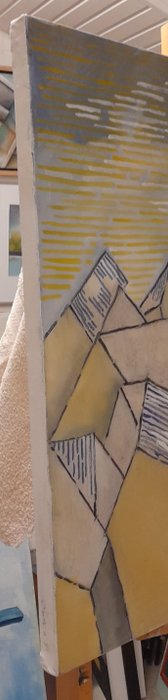 Dit schilderwerk is geschilderd op katoenendoek gespannen op een raamwerk van 2,54,5 cm, dat is voor behandeld met Gesso waarna eerst een laag olieverf gebroken wit met structuur is aangebracht ,waarna mijn visie over de daken, metolieverf. Het is ontstaan door 2 aspecten, ten eerste ben ik op bezoek geweest in Frankrijk in het plaatsje Chinon, als je daar naar boven wandelt, krijg je een prachtig uitzicht over de daken van het plaatsje., ten tweede ,op de academie kreeg ik de opdracht om een schilderwerk te maken Thema "minimalisme", en dit leek mij een goed voorbeeld om de daken te bestuderen , en of hier iets mee te doen was. Bij het foto en schetsmateriaal kun je zien hoe ik tot dit werk ben gekomen.