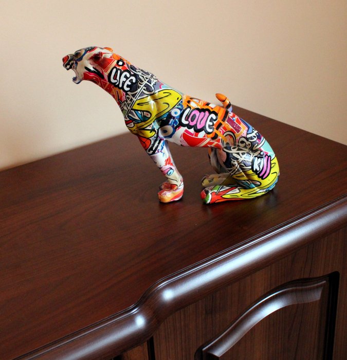 De gepard is gemaakt van hars. Het is gestileerd door de kunstenaar met acrylverf.