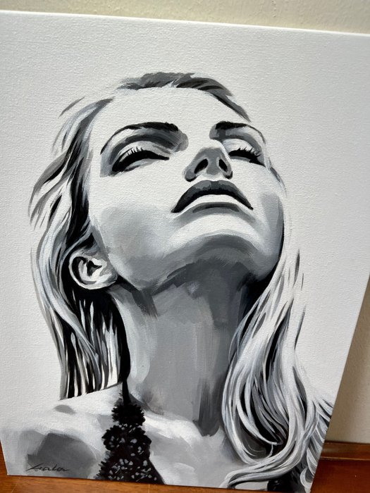 Zwart-wit schilderij van een mooie vrouw in acrylverf op canvas door G. Bukova - kunstenaar met diverse internationale tentoonstellingen.