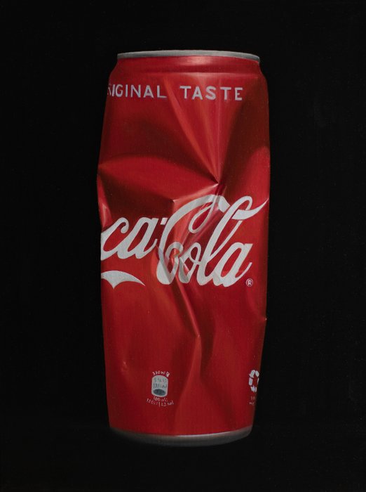 Het werk maakt deel uit van een serie schilderijen die ik maak van omslagen, pakjes, containers voor gangbare producten of modeaccessoires. Alle artikelen gerelateerd aan bekende merken zijn in massa geproduceerd en identiek aan elkaar. Alleen het gebruik waarvoor ze gemaakt zijn maakt ze uniek, zoals dit geplette blikje Coca Cola.